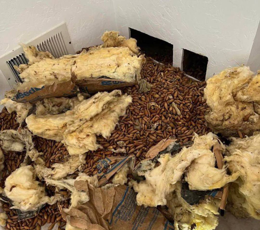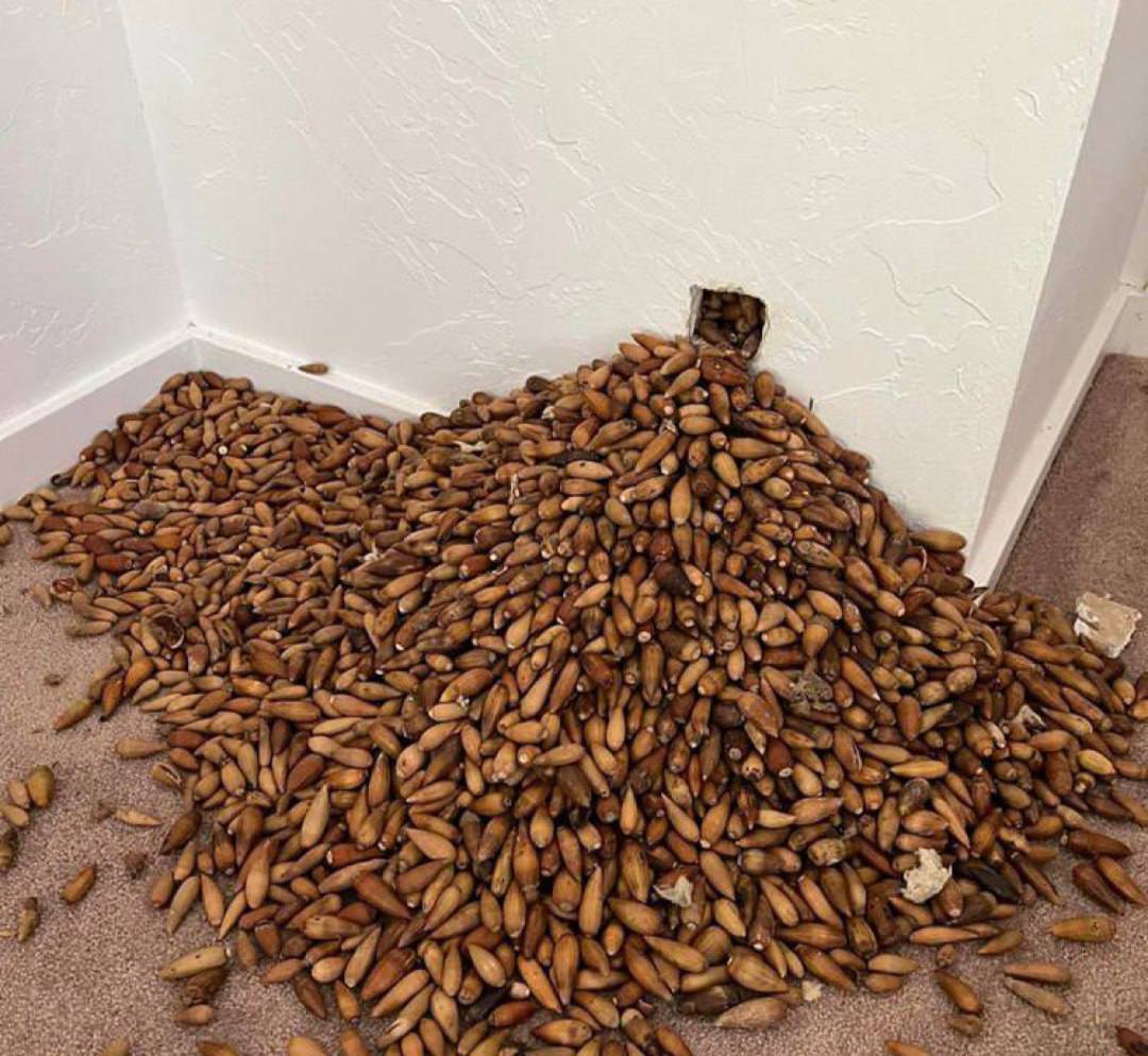 Неожиданный подарок от дятла получили жители одного из частных домов в Калифорнии. Он спрятал в стене их жилища почти 320 кг желудей. Обнаружить такую огромную заначку помогли дезинсекторы, которых вызвали хозяева. Дело в том, что в последнее время их начал беспокоить постоянные шорохи в стене.