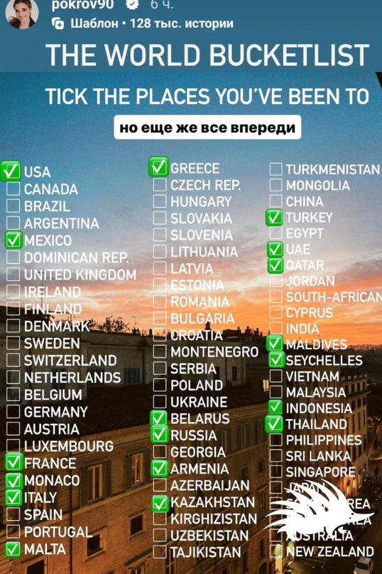 Она составила список из классических туристических направлений. Ей удалось посетить Францию, Италию, Испанию, Германию. Не обошлось и без посещения экзотических мест. Ей понравились пейзажи Таиланда, Бали, Мальдив. Девушка посетила Африку, Марокко, Кению. Ее окружала фантастическая природа с животными. Много чего предложили посмотреть, когда она посетила Бразилию и Мексику.