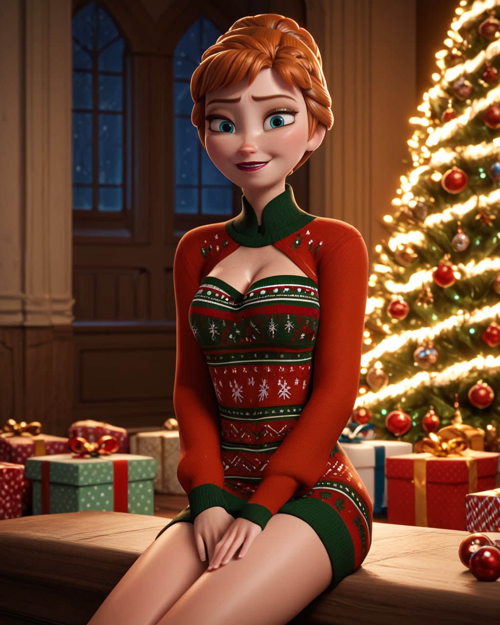 На фоне замерзшего озера Анна стоит в полупрозрачном белом платье, напоминающем морозное кружево. Её рыжие волосы развеваются на ветру, а дыхание создает легкие облачка пара. Бирюзовые глаза полны решимости и чувственности. Платье облегает каждый изгиб её тела, а белая прядь в волосах словно подчеркивает её связь с магией льда. Она выглядит как воплощение зимней сказки, где страсть встречается с холодом.