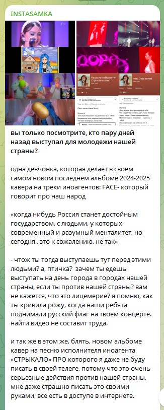 Инстасамка обвинила певиц Дору и Мэйби Бэйби в недостаточной патриотичности, утверждая, что они «разрушают Россию в мягкой форме». В своем посте, который можно расценить как донос, она указала на то, что Дора исполняла каверы на песни иноагента Face и украинской группы «Валентин Стрыкало», которые, по ее мнению, угнетают Россию. Дора ответила, что эти каверы были записаны в начале ее карьеры и под другим псевдонимом.