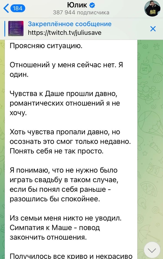 Или под давлением разъяренных подписчиков, или из чувства стыда, но Юлик решил объяснить свой поступок.