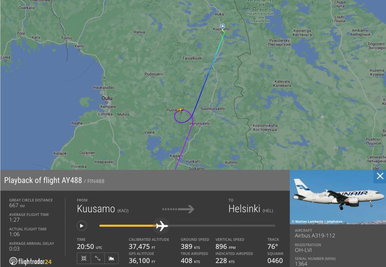 Пилот авиакомпании Finnair решил подарить своим пассажирам незабываемый вид и мягко говоря отклонился от курса - он развернул самолет на 360 градусов. Рейс был из Куусамо в Хельсинки. Пассажиры конечно были рады. По данным Flightradar24 это не первый случай такой самодеятельности от пилотов гражданской авиации.