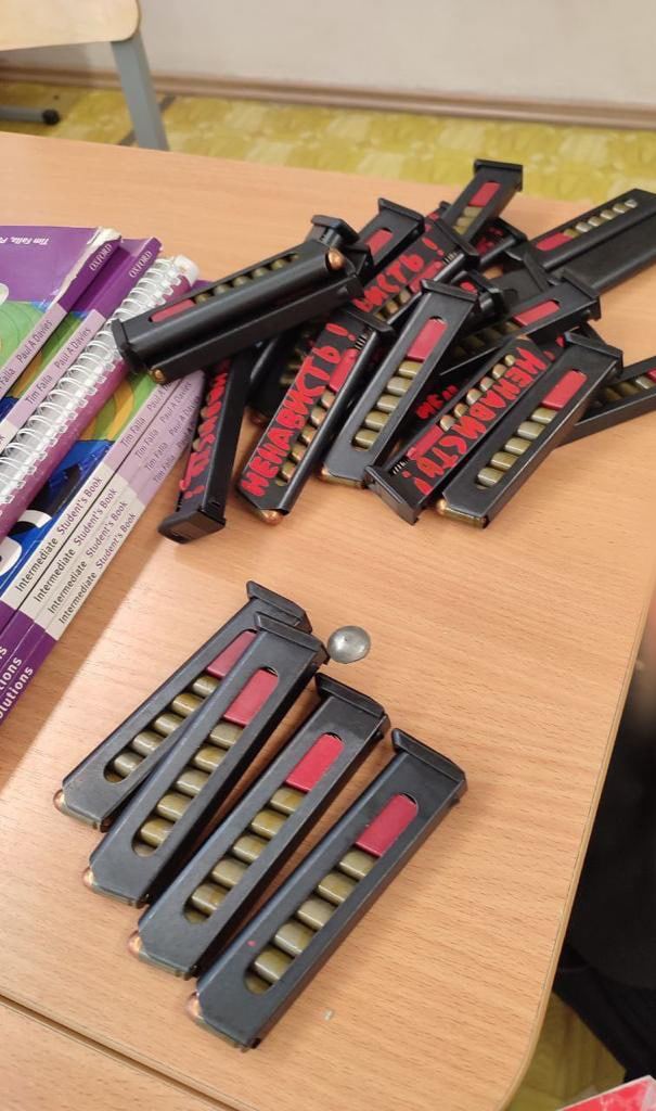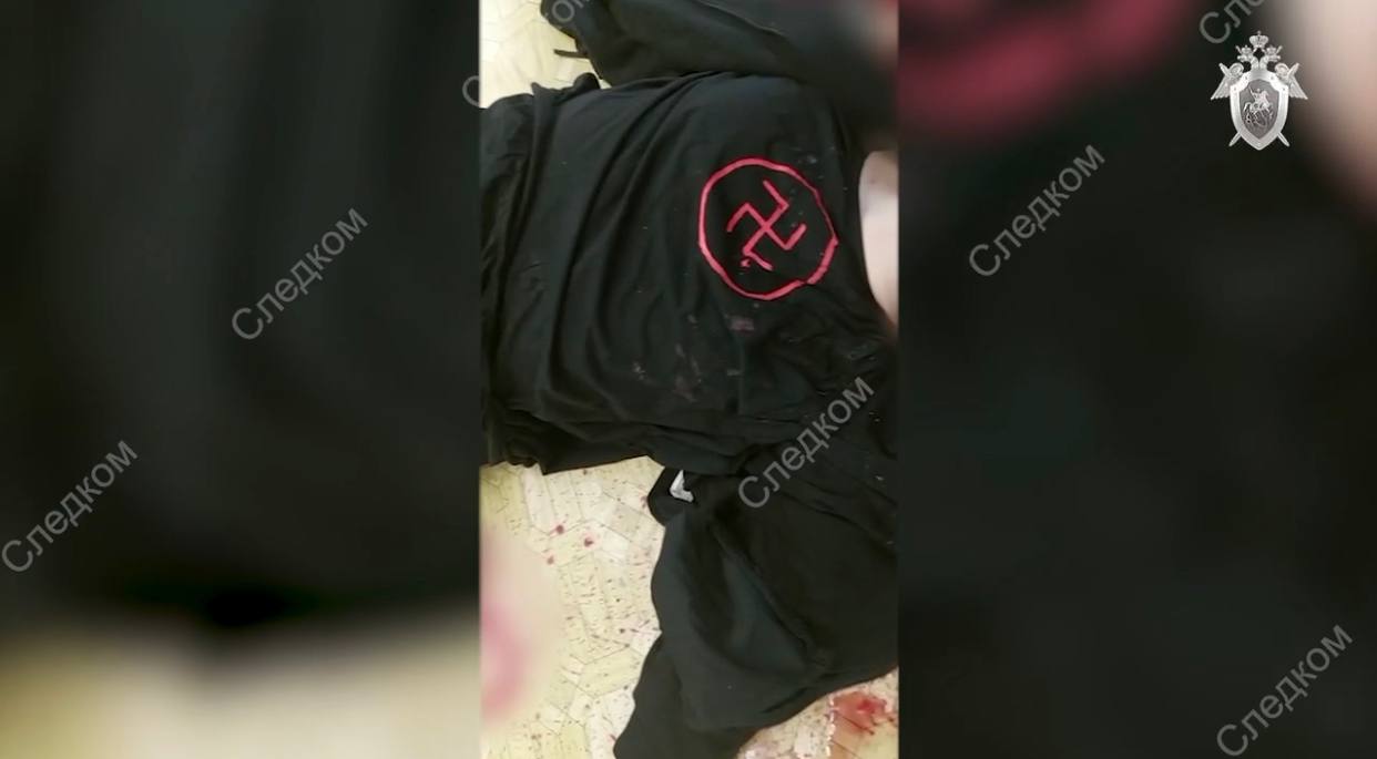На одном из них надпись «ERIC DYLAN» — отсылка к стрелкам, совершившим массовое убийство в школе «Колумбайн». На втором пистолете надпись похожа на «COLUMBINE». На груди у стрелка можно заметить свастику.