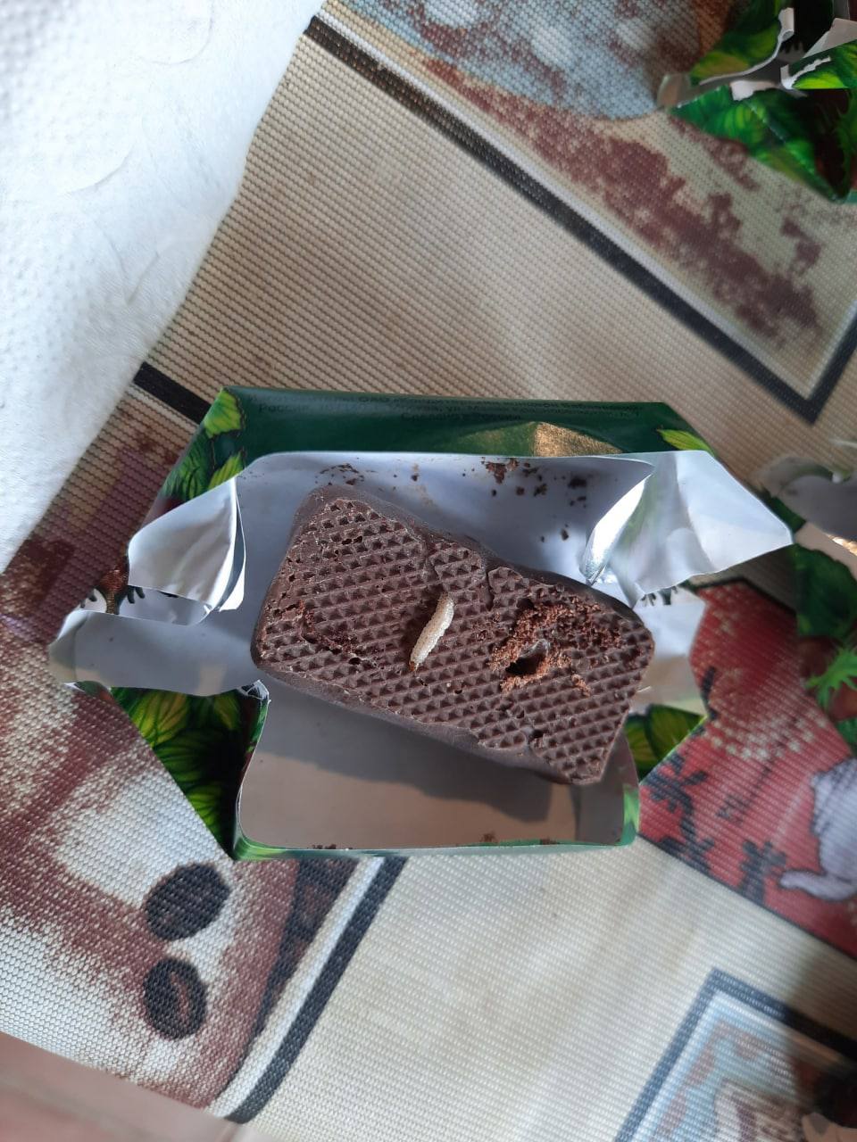 Мужчина решил купить пачку конфет «Белочка». Когда он дошел до дома, заварил долгожданный чай и уже развернул конфету, а там его встретил весьма неприятный сюрприз: в конфете оказалось маленькое отверстие. Разломав сладость, покупатель обнаружил там личинку.