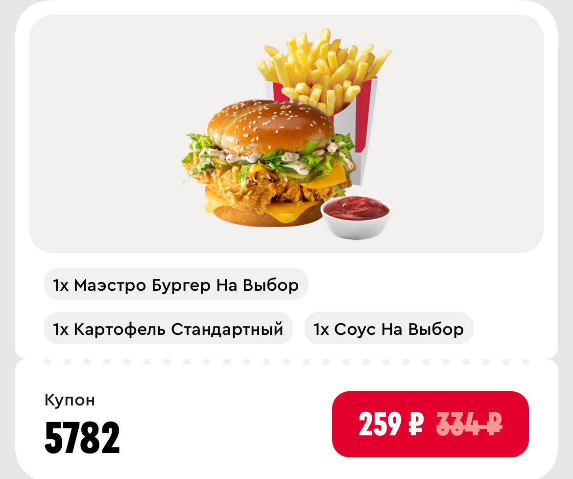 Получаем Маэстро Бургер + Картофель Фри + Соус за 259₽ в KFC