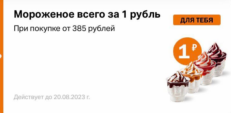 Мороженое за 1₽ при покупке от 385₽ в Вкусно и точка