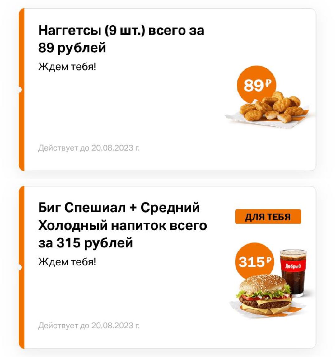 Получаем «Наггетсы (9 шт.)» за 89р или «Биг Спешиал + Средний Холодный напиток» за 315р в приложении «Вкусно и Точка»