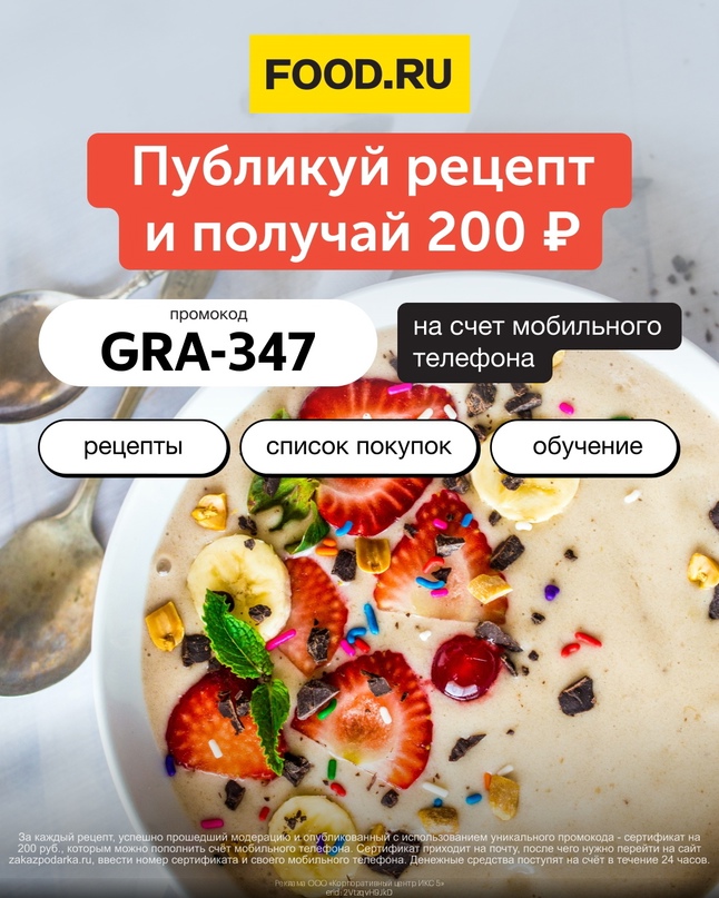 Публикуйте рецепт и вводите промокод на сайт Food_ru, получите бонус